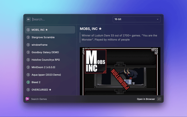 Raycast Extension for itch.io wihch lets your browse through milions of games made by indie developers!