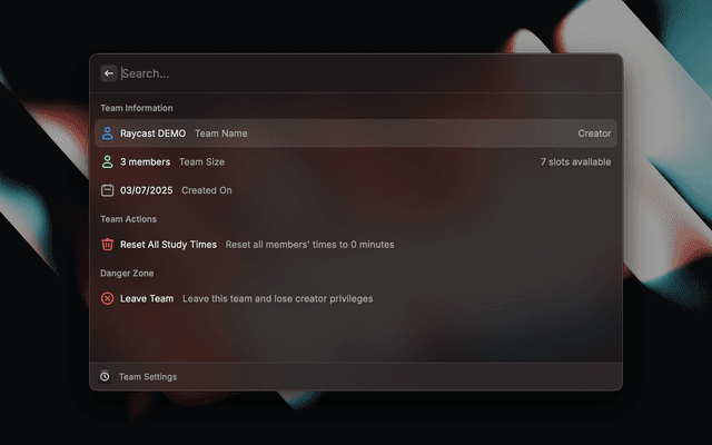 2. Create a Team in Raycast Use the Create Team command in Raycast. Paste the webhook URL, set a team name and your username. You’ll receive a Team Code — share this with your teammates.
