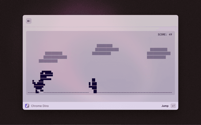 Want to play the Chrome Dinosaur game without opening a browser? We got you. Jump over cacti and gain points in this fast-paced endless runner game.