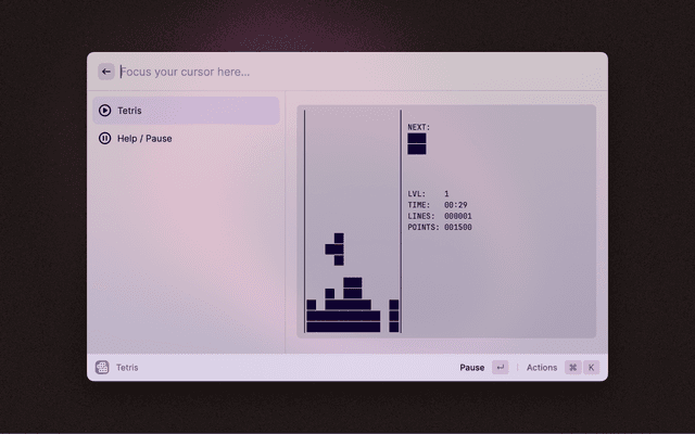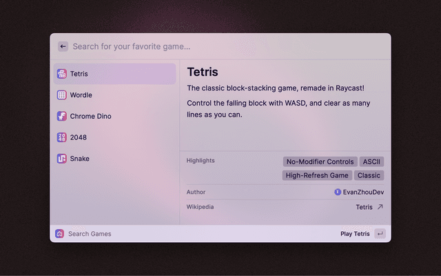 The classic block-stacking game is back for its Raycast debut! Clear rows with the WASD keys, and get points!
