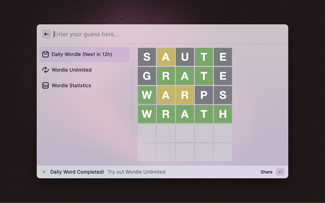 Challenge your vocabulary and logic with Wordle in Raycast. With nearly the exact same word-guessing interface as NYT, it’s a familiar experience. It even syncs to the New York Times daily puzzles, so you can keep up-to-date with your friends.