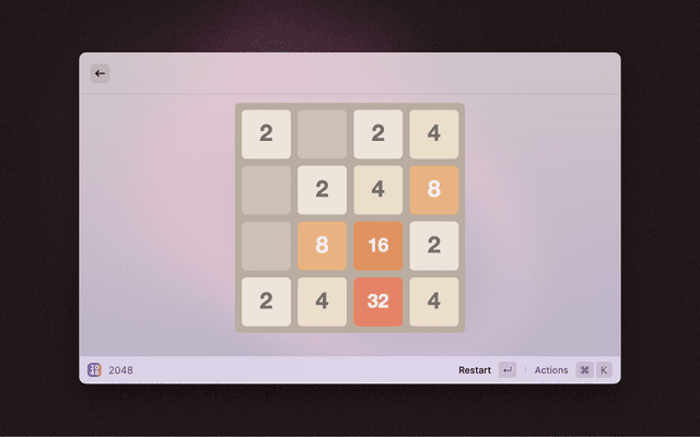 Play the number-merging game, now beautifully recreated in Raycast! See if you can get the coveted 2048 tile, or even higher!