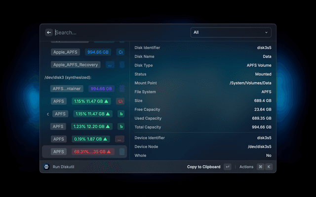 View your disks and volumes. An implementation of the macOS 'diskutil' command with quicker access to functionality, providing a better overview and a more user-friendly interface.