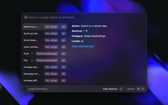 Search Lazygit keybindings by action or shortcut, with language selection. The extension fetches the official Lazygit docs at runtime, caches them locally, and lets you filter by the locale you prefer.