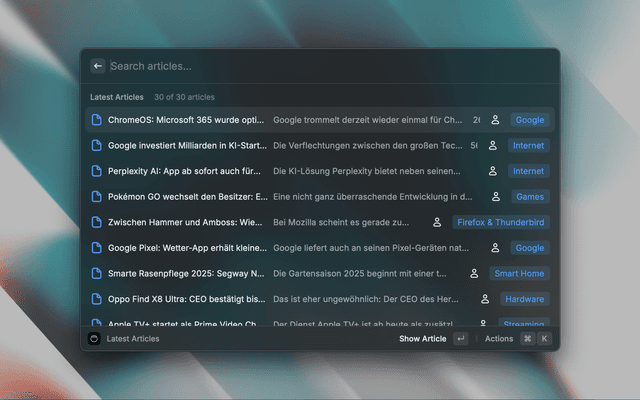 • Quick actions for opening articles in browser and copying links