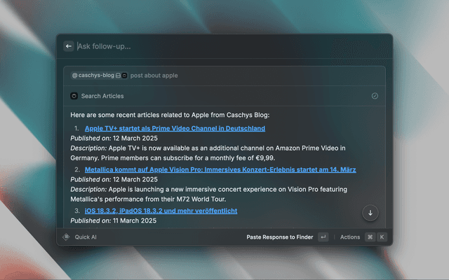 The AI assistant allows you to interact with Caschys Blog using natural language. You can: