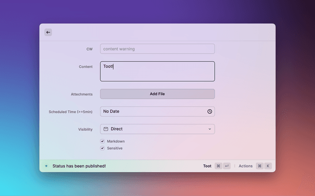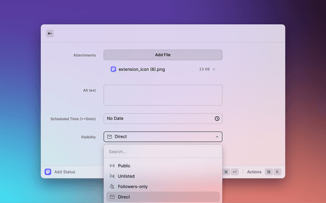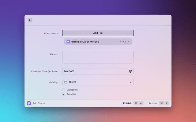 • Publish status with attachments (image, video, files); add alt text to the image when only one image is attached.