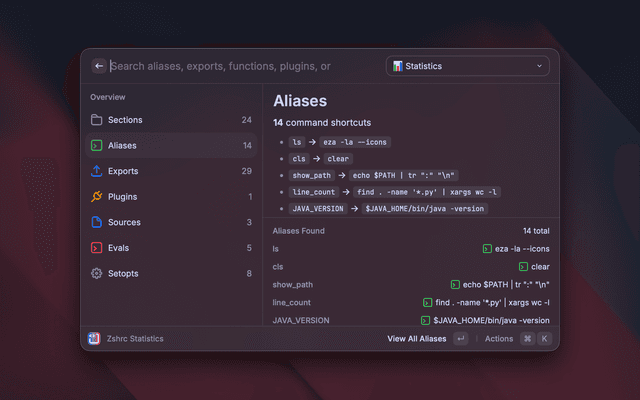 | 📝 | Section Management | View zshrc content organized by logical sections with detailed breakdowns |