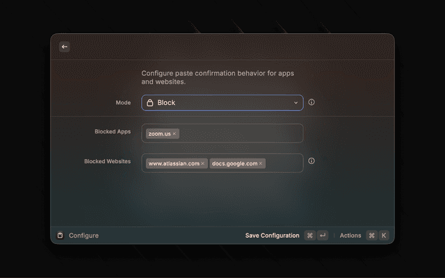 It adds context-aware confirmation before pasting, based on the frontmost app and (when available) active browser website.