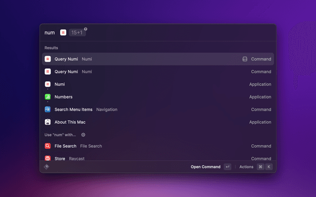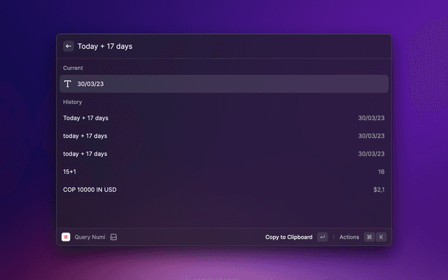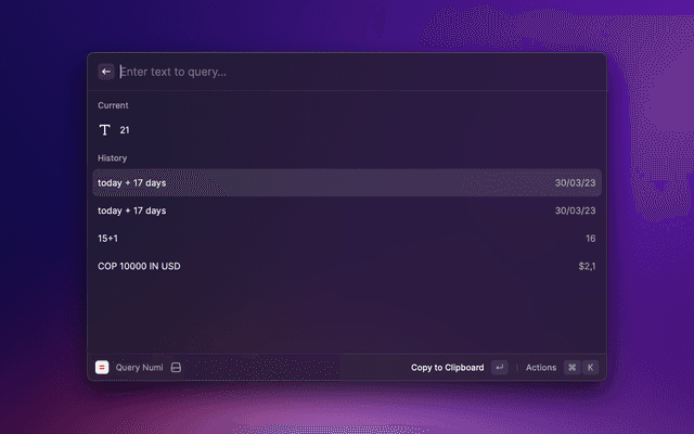 This is a Raycast extension with commands to query anything on Numi app. To use it, install the extension from the Raycast Store, enable the Numi API, open Raycast Search and type the following commands):