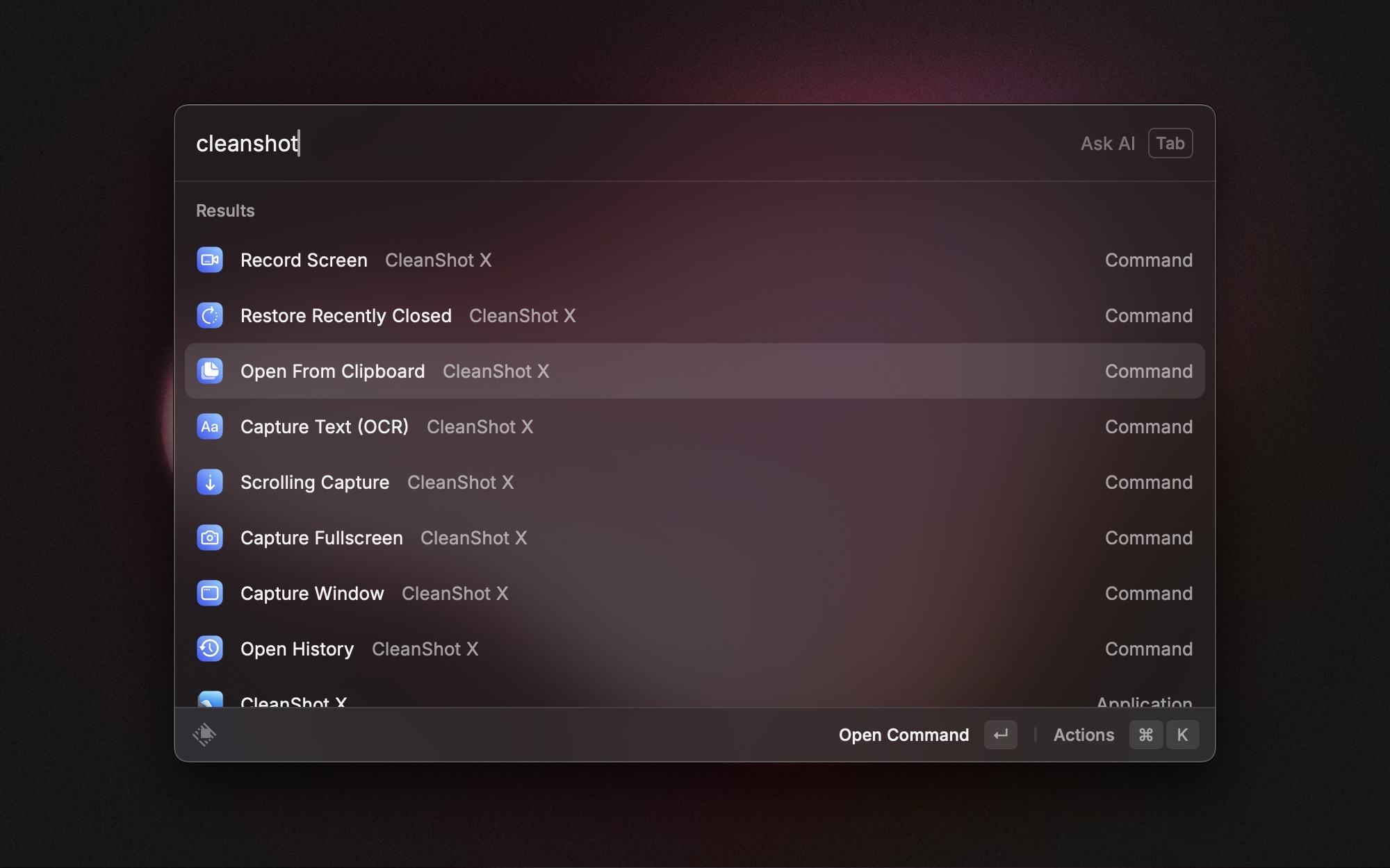 CleanShot is a great way to take screenshots on your Mac. If you happen to use it, there’s an extension made by Aayush for that. It allows you to quickly launch some commands such as Capture Area, Capture Text (OCR), or Open from Clipboard.