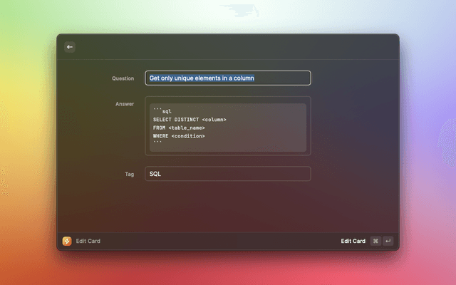 To view all the details for a specific card, you can view that card details and it will show the "question", "answer" in markdown, and the tag.