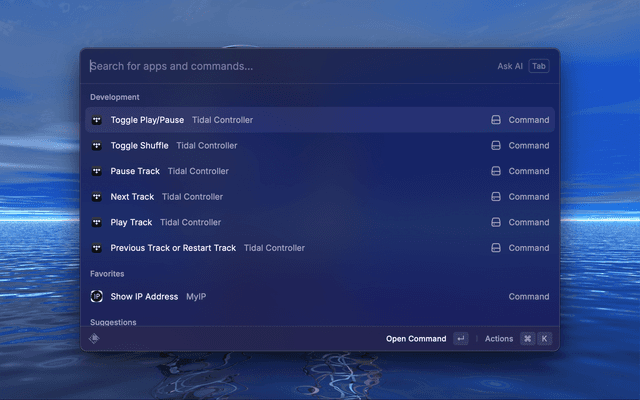 This extension does not currently make use of any GUI or windows apart from simple alerts to show the status of the playback and to confirm actions. Simply search for "Tidal" in Raycast to see all available commands. It's highly recommended that you set shortcuts for the commands you wish to use.