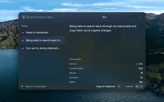 • App filter — filter by which app you were dictating into (Slack, VS Code, Chrome, etc.)