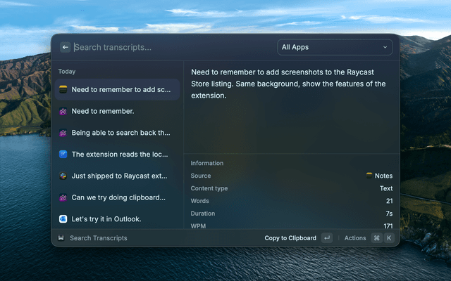 The all-in-one Wispr Flow companion for Raycast. Search your transcription history, manage your custom dictionary, and control voice recording — all without leaving your keyboard.
