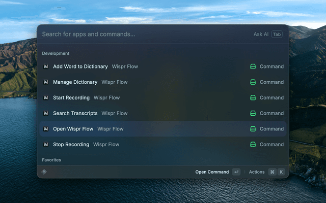 • Start/Stop Recording — trigger Wispr Flow dictation via Raycast with no-view commands