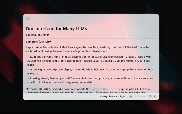 This hybrid approach gives us the best of both worlds: Defuddle's battle-tested extraction patterns with tight Raycast integration.