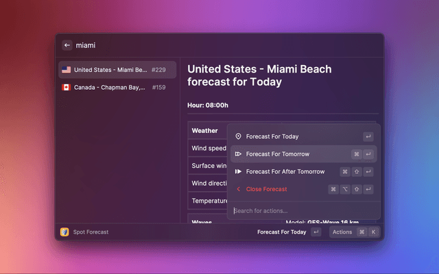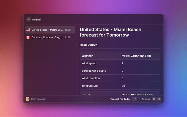 All data is currently being fetched from Windguru. Windguru employs multiple data models for both weather and waves, and depending on the spots chosen by you, different models may be chosen to provide you with weather and wave information. In future versions of the extension I'm planning to cross different services so that the forecasts may be more reliable. It's a work in progress, but with your feedback we can make it faster.