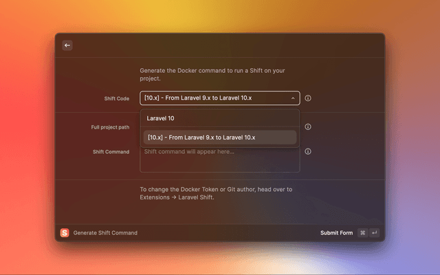 This Raycast extension allows you to generate any of the Docker Shifts for Laravel, Lumen, PHP, Django, and Tailwind. See te official Running Shift for Docker docs for installation and setup.
