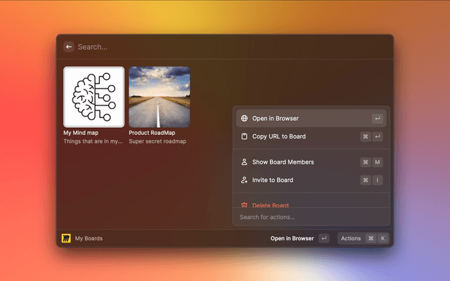 Create, search and copy link, open Miro boards and more.