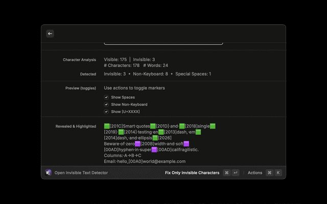 - Analyze Clipboard for Invisible Characters: Shows a quick summary and copies a detailed report.