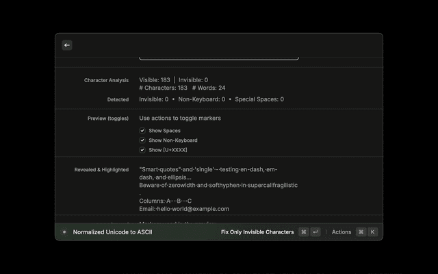 - Fix Invisible Characters: No‑view quick cleaner that operates on selected text or clipboard using your default mode.