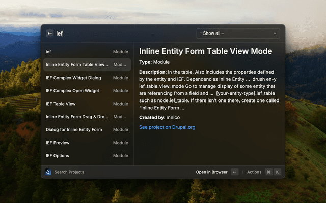 This command lets you search in Drupal's API. It will return the first 50 items from api.drupal.org based on your search text. You can open a specific item in your browser by pressing Enter. Further actions like copying Drupal core's location are also available.