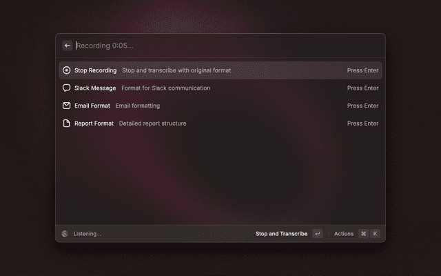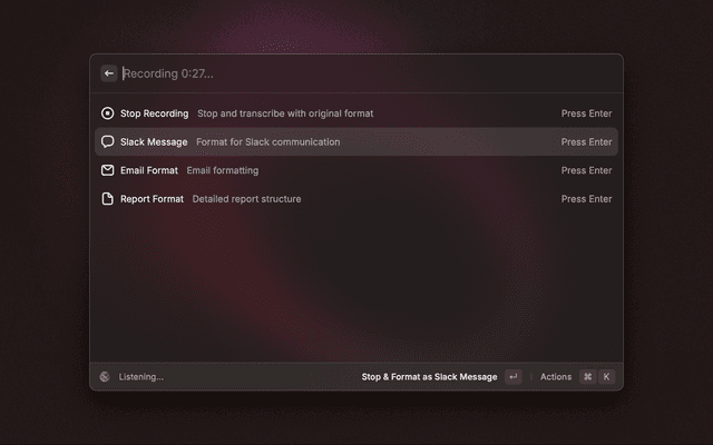 3. Press Enter to stop and transcribe, or select a specific format (Email, Slack, Report)