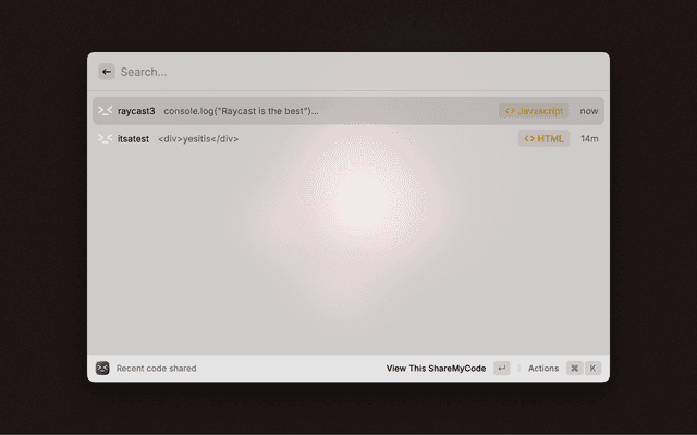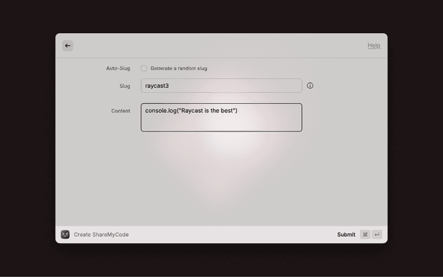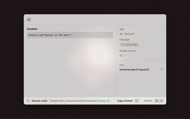 Quickly create shareable code snippet with ShareMyCode directly in your Raycast ecosystem.