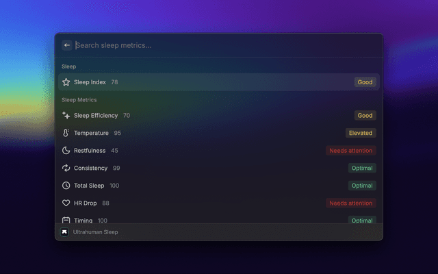 Ultrahuman Sleep – Get detailed insights into your sleep metrics including sleep score, efficiency, temperature, restfulness, consistency, and more.