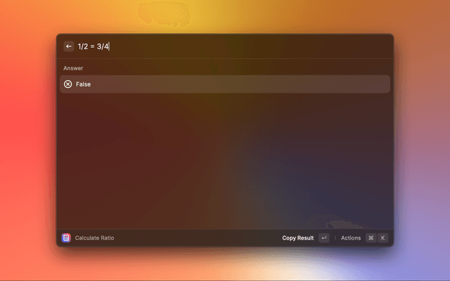 = to seperate ratios, whitespace will be ignored (meaning you can write 1 / 2 = x / 2 6 without any problems!)1/2 2/4 will work, 1/2 2 /4 will not)16/9 = width/1234= and then the extension will output whether they are equal!