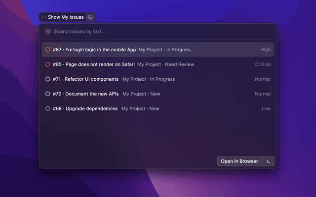 • Find your currently assigned issues, filter using Raycast by issue ID or subject keywords.