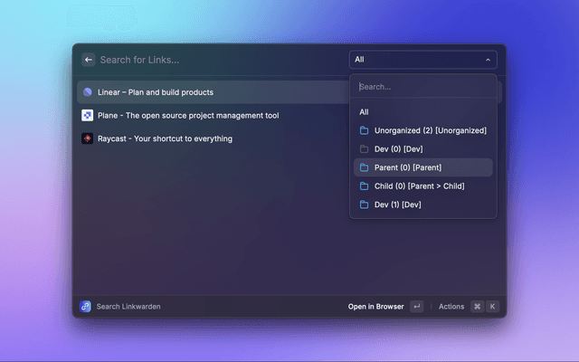Manage your Linkwarden bookmarks directly from Raycast. You can add new bookmarks and search through your existing ones effortlessly.