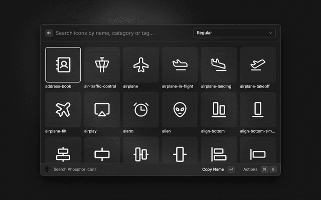Pick icon style from search dropdown and copy icon as name, HTML element, React or Vue component
