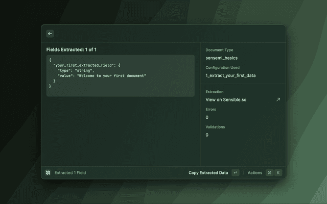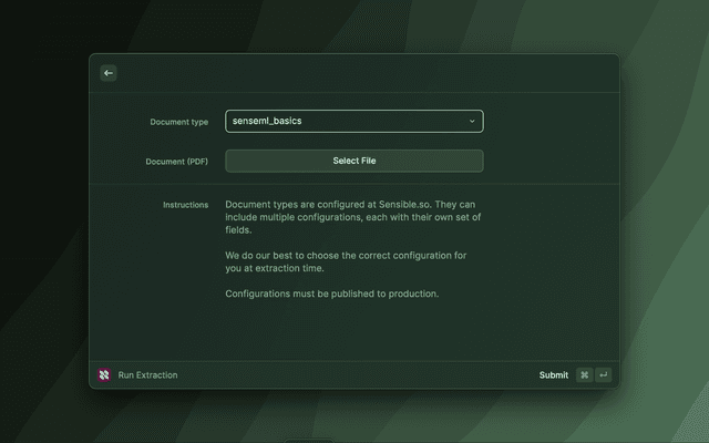 If it's your first time using Sensible, we recommend you checkout https://docs.sensible.so/docs/ui to get a quick overview of how to get started.