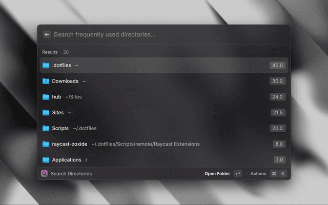 Search through your most frequently accessed directories using the same zoxide + fzf combination used in the interactive version of the zoxide command right from within Raycast. Directories opened via the extension will have their score increased the same as if they were accessed via the command line.