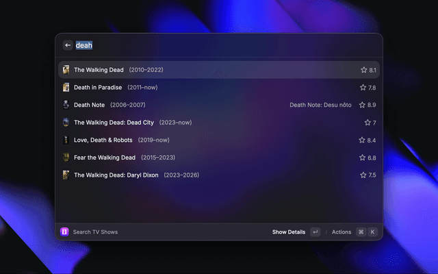 A Raycast extension to search TV shows and visualize episode ratings with graphs.