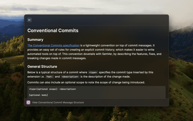 Provides a list of conventional commits prefixes and descriptions that can be inserted into your active window as well as example of how messages should be structured