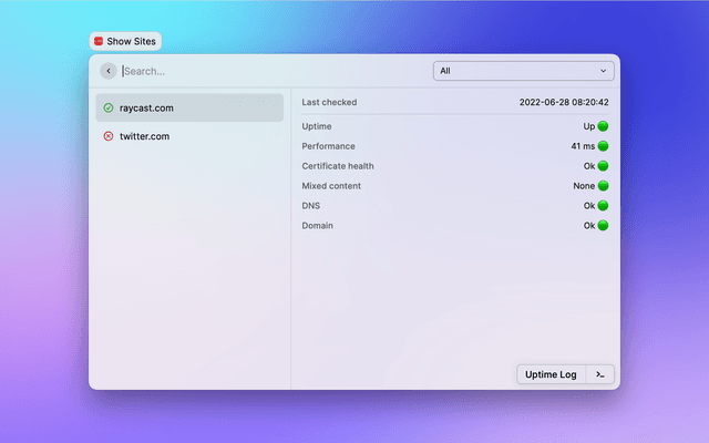 Using this Raycast extension you can view the monitoring results of all your sites and add new sites to monitor to Oh Dear.