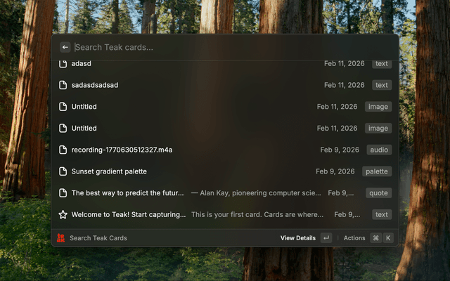 Quick Save: Save text or URLs to Teak without context switching.Search Cards: Search across Teak card content, tags, and metadata.Favorites: Open and copy from your favorited cards.https://app.teakvault.com/settingsapp.teakvault.com and Convex endpoints.
