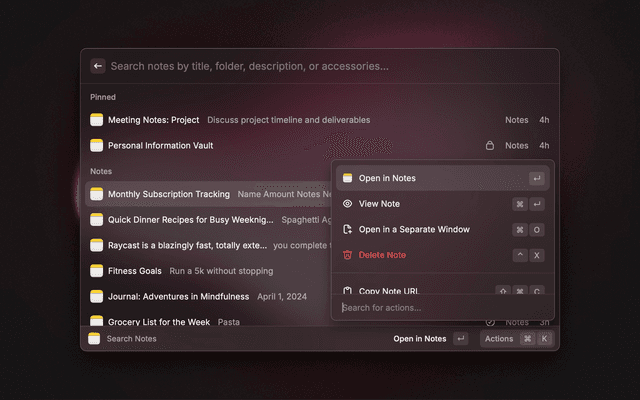 Search for and create Apple Notes directly within Raycast.