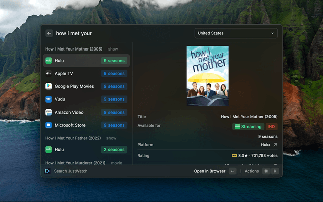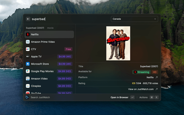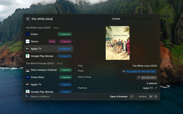 Instantly find out if a movie or show is available for streaming, rent, or purchase.