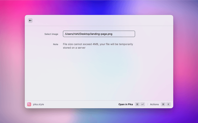 pika in RaycastOpen URL in Pika and Open Image in PikaOpen Image in Pika: You can select an image using Cmd+O from your system and open directly in PikaOpen URL in Pika: You can enter a website URL or image URL and open in PikaPlease email hi@pika.style for bug reporting or feedback