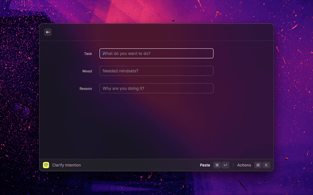 This Raycast extension is designed to assist users in clarifying their intentions and selecting appropriate moods for their tasks. It consists of two main commands: clarify-intention and select-moods. The select-moods command supports the clarify-intention command by providing a curated list of moods to enhance the intention setting process.