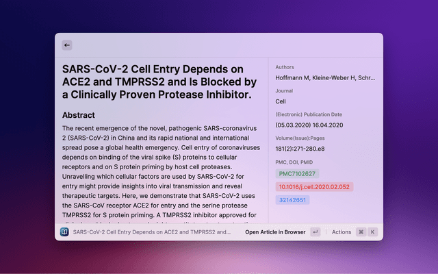 Search PubMed, a free database maintained by the National Library of Medicine (NLM), with Raycast. If the search entry is empty, 10 Trending Articles (from https://pubmed.ncbi.nlm.nih.gov/trending/) are displayed and cached. You can set the refreshInterval in settings.