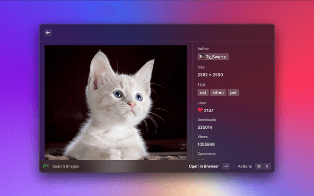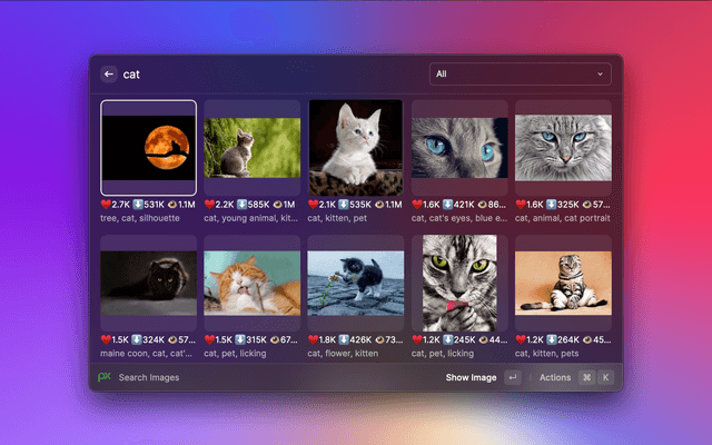 Search images or collections on Unsplash, download, copy or set them as wallpaper without leaving Raycast!