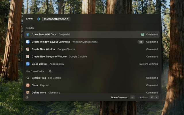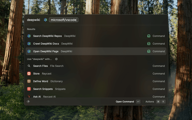 • Search DeepWiki Repos: Search for repositories indexed by DeepWiki directly within Raycast.