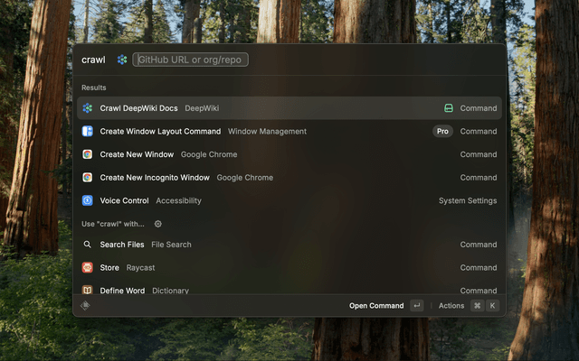 • Usage: Activate Raycast, type Crawl DeepWiki Docs, enter the repository identifier, and press Enter. Alternatively, use the Cmd+Shift+K shortcut on a result in the "Search DeepWiki Repos" command.
