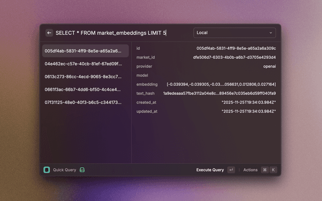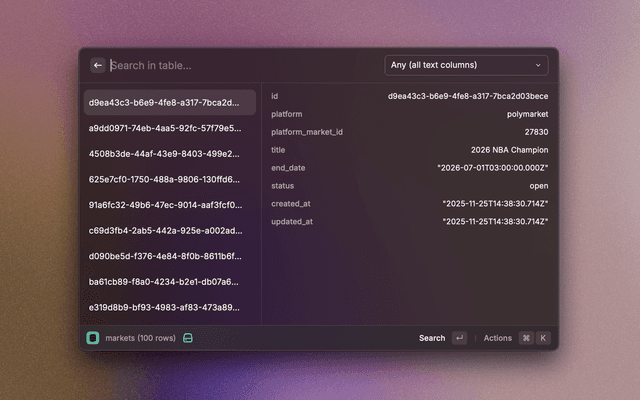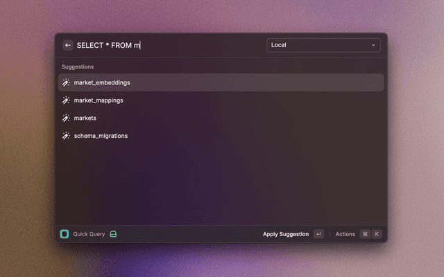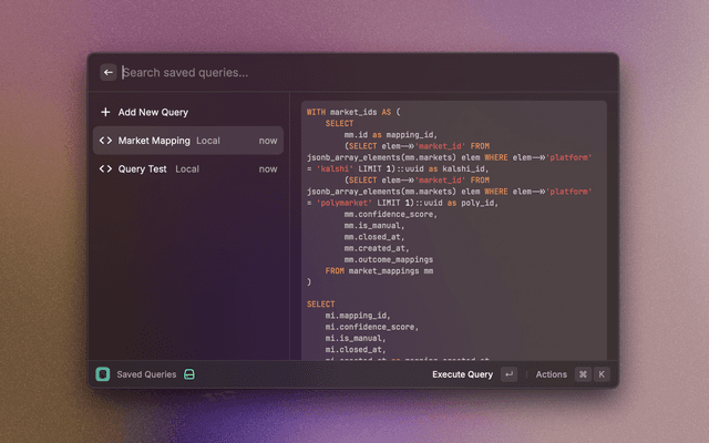 A Raycast extension to query and browse your PostgreSQL databases. Useful when you need to quickly check data or run queries without opening a separate database client.