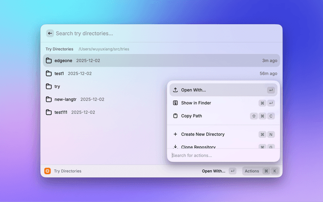 Open Raycast and search for "Browse Try Directories" to see all your experiments.